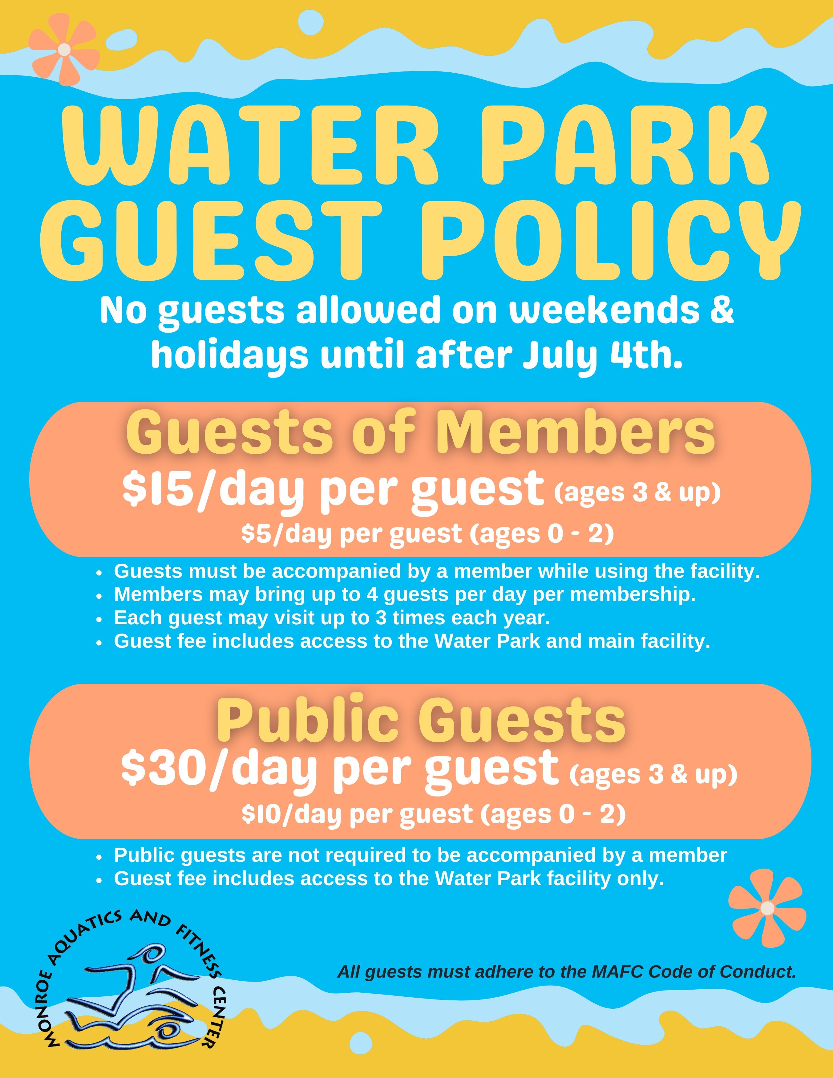 The Water Park will temporarily close when storms are in the area. If thunder is heard or lightning is seen, the park will close for 30 minutes. The park will reopen following 30 minutes of no thunder or lightning. During this time, members will be asked to leave the deck.