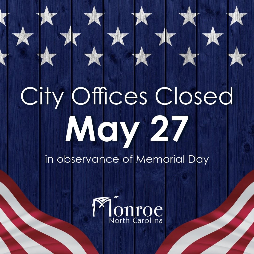 The City of Monroe's administrative offices will be closed on Monday, May 27, 2024, in observance of the Memorial Day holiday.
