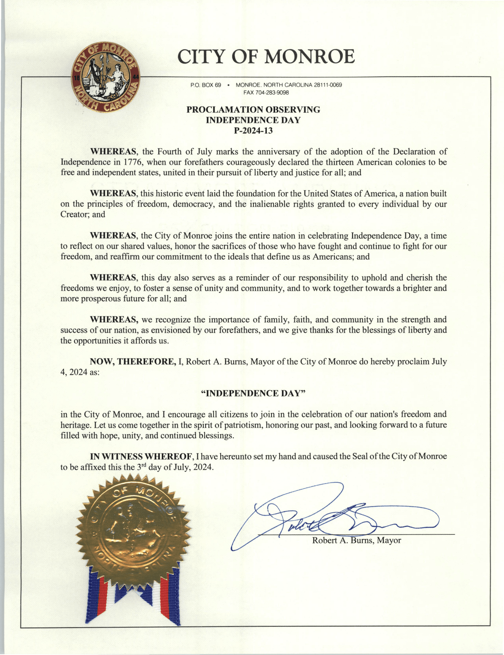 NOW, THEREFORE, I, Robert A. Burns, Mayor of the City of Monroe do hereby proclaim July 4, 2024 as: